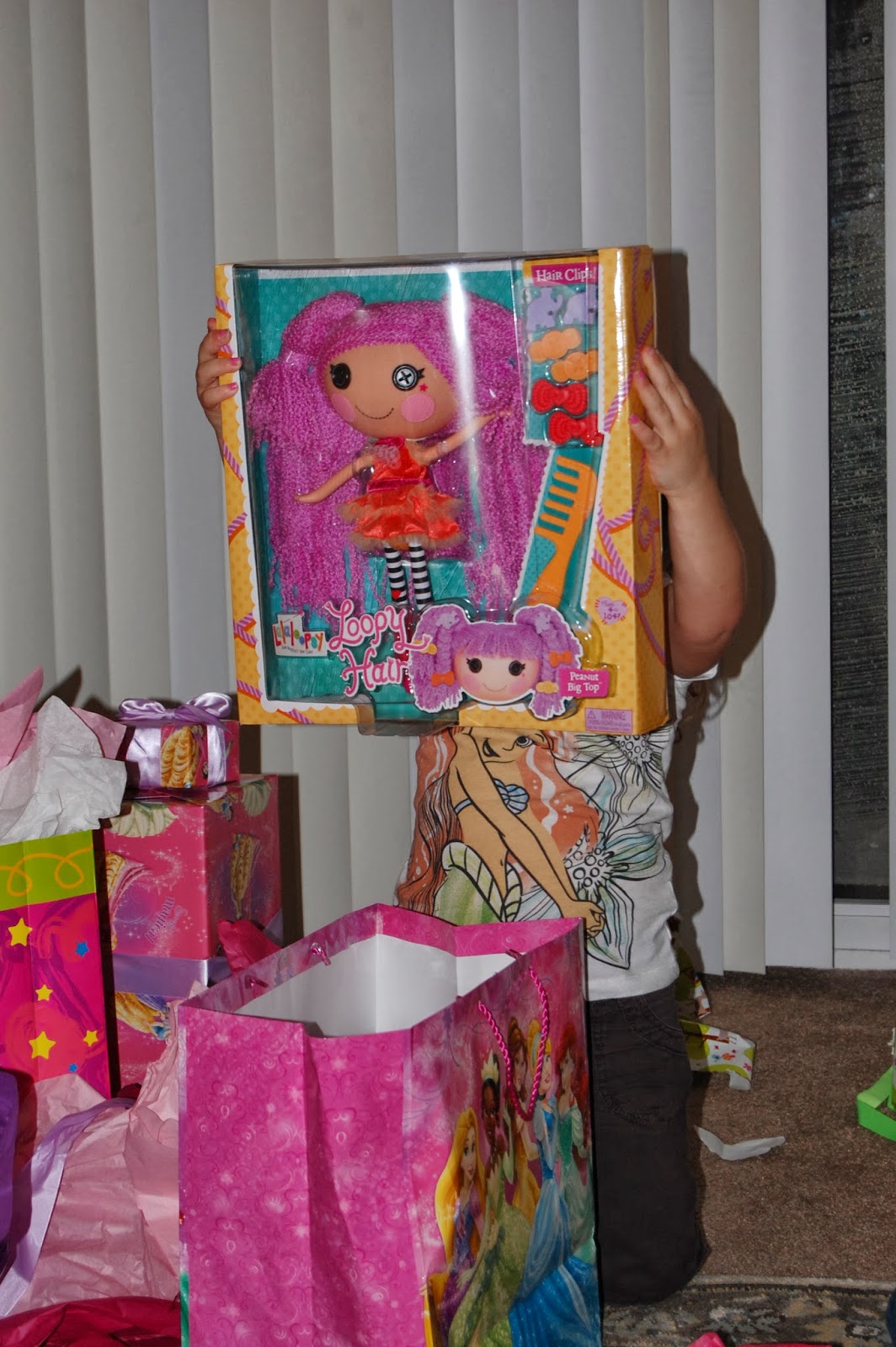 After some shopping we headed out for dinner at Abby’s favorite place, you guessed it, Red Robin! Hey, she is the birthday girl and she gets to pick. After a yummy dinner and some great conversation it was back home for presents. When we arrived, Abby was greeted by a table full of fun and colorful boxes as well as a cute mural and Mario play set made by daddy. She was super thrilled.