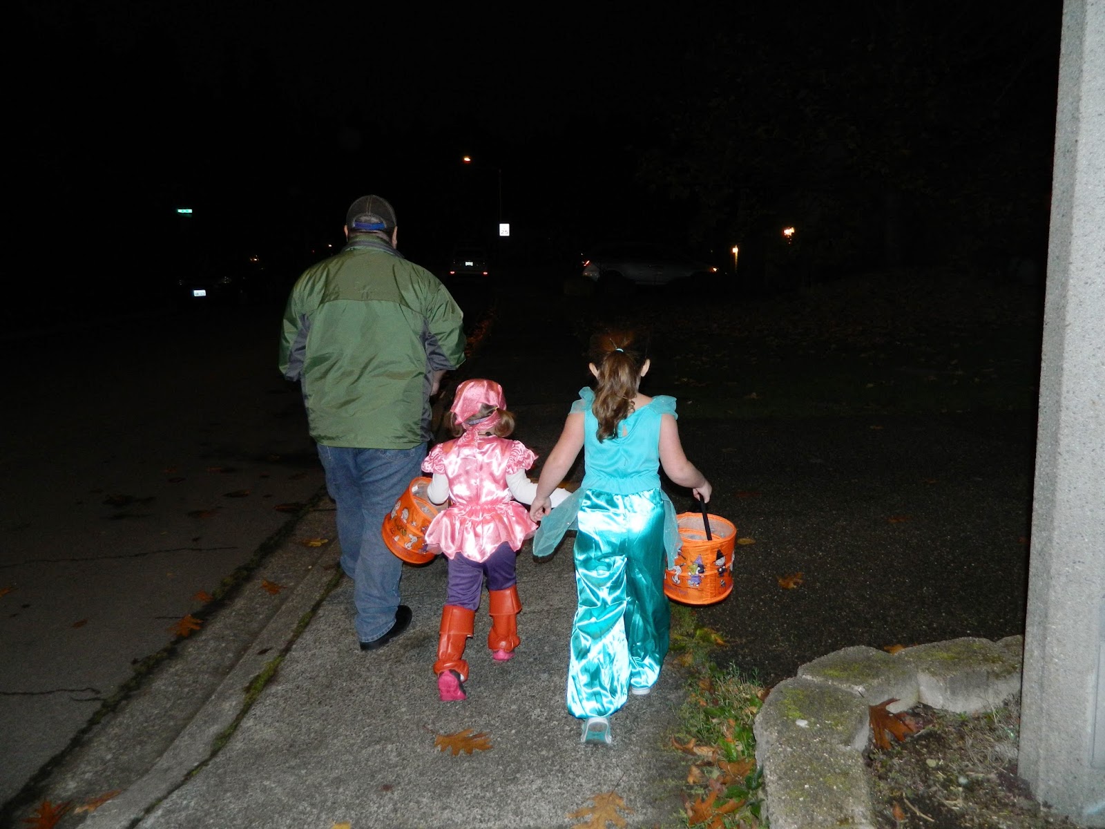 The weekend before Halloween we drove around town scoping out neighborhoods to go to. Being that we live in a town home community, we knew that the girls might be a tad limited to what they could do. So we found a few places that had some great decorations and headed that way. It was well worth it and the girls had a great time collecting their “loot” and enjoying some of the very creative decorations. Several of the homes took a lot of courage for the girls to explore but they did it and had a blast scaring themselves in the process. Ah, to be a kid!