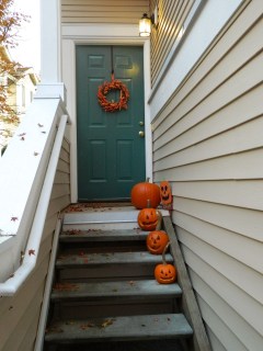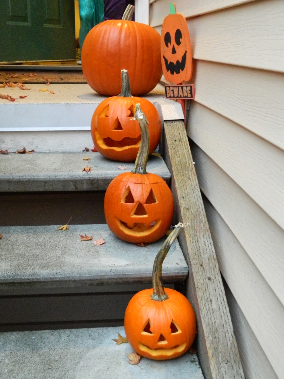 | Our porch with our cute and creative Jack O’ Lanterns. |