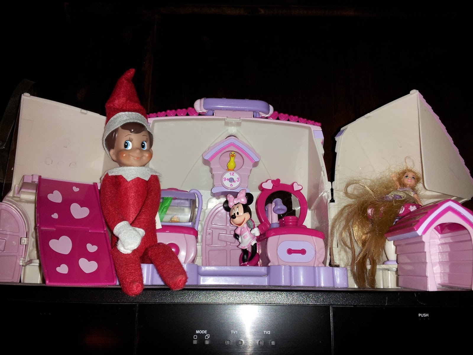 This year we started the Elf on the Shelf tradition with Abby and Ellie. We sat down together last night and read a book that explains the elf, why he comes to our house and just how magical he is. Our Elf made it all the way from Santa’s workshop to our house and after thinking long and hard, Abby and Ellie came up with his name. Ladies and Gentlemen I would like to introduce to you… Dasher the Wharton Family Elf. For his first day in the house, Dasher made himself comfortable perched high up on the TV unit. It looks like he tried to get into Minnie’s mouse but I have a feeling she wasn’t home. He has been watching over Abby and Ellie all day and in return they have talked with him and told him a few things they want for Christmas. It was cute to watch. I cannot wait to see what happens next!