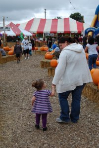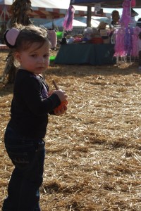 After our visit with the farm animals and a little shopping at the country store, it was time to pick the perfect pumpkin. Both Abby and Ellie chose their pumpkins pretty quickly but I think we still spent about 45 minutes out in the field watching the girls play among the massive amounts of pumpkins. Abby even stopped to build a birds nest in the hay. Ellie was singing songs and from what I could hear, I think she was pretending to be a princess and each pumpkin was a castle. While I couldn’t tell exactly what was happening it was still cute to watch.