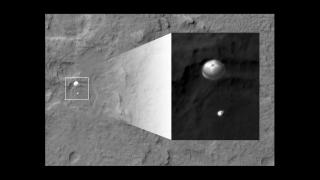 | This image was captured by the Mars Orbitor as Curiosity began its dissent to the Mars surface. |