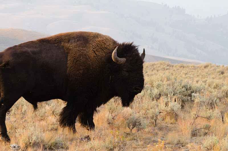 After the excitement of the moose we continued on our way out to Lamar Valley. Lamar was pretty quiet and the heat of the day was most likely keeping the larger animals in the shade of the trees. We did see plenty of pronghorn, some of the big male bison and an eagle off in the distance. We went as far as we had time for and then turned around. The next plan of action was to find some lunch and hopefully a few more of the big animals. So with that we headed up and over Mt. Washburn and down to Canyon Village for some lunch.