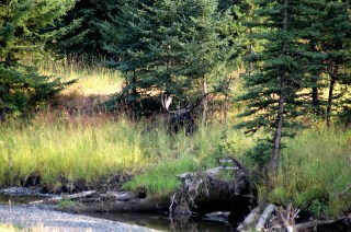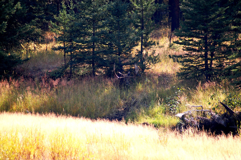 A very small group of people had stopped just off of the road near an open field. We were stuck behind a small hill but got out of the car to see what was going on. Just as we made it to the top of the little hill we saw the big bull moose, sauntering across the field. He was less then fifty yards away but well within a safe a difference from us. It has been a long time since we have seen a bull moose and this close too! He seemed content with us nearby and just went about his business walking through the field and up into the trees. We hopped into the car and drove further up the road to a pull out near petrified tree. From there we pulled out our binoculars and watched the moose head to a small meadow. He took his time there, eating and drinking from what must have been a small stream or pond and then decided to lay down for a late morning snooze.